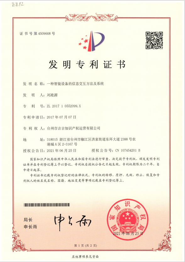 一種智能設(shè)備的信息交互方法及系統(tǒng)專利證書